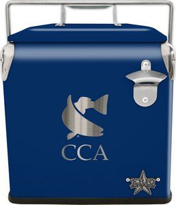 Keep your drinks and food cool with this snazzy blue cooler. Made from stainless steel, this cooler can hold eighteen cans or twelve bottles with a sufficient amount of ice. It also includes a steel bottle opener and a laser engraving.